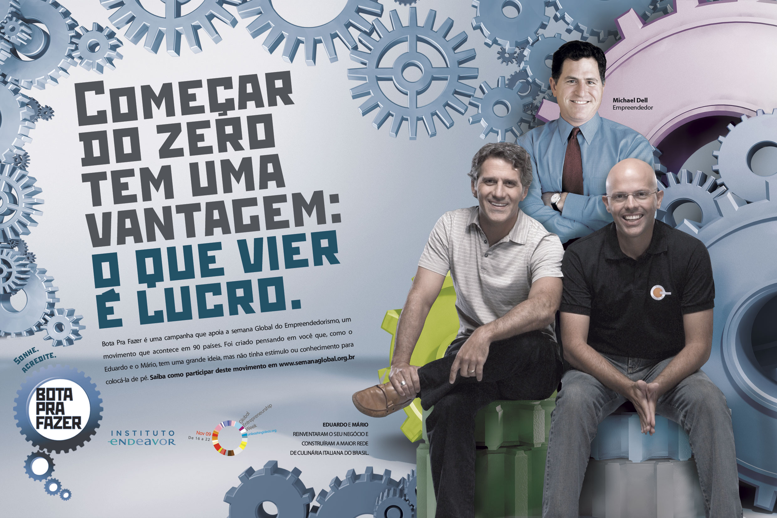 A campanha desenvolvida pelo Instituto Endevor também volta com força total para divulgar a semana e traduzir o conceito de empreendedorismo no Brasil, estimulando a atitude empreendedora nos brasileiros.
