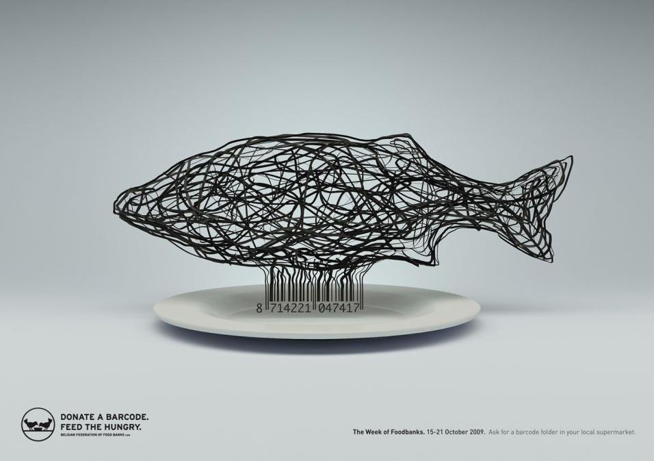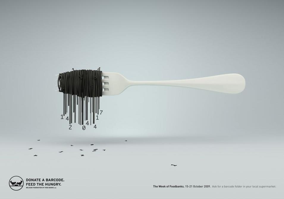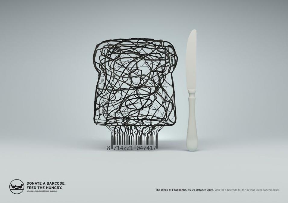 Campanha da Belgian Federation of Food Banks criada pela agência belga Germaine. A campanha faz parte do projeto de “Bancos Alimentares”, que tenta aproximar os doadores daqueles que são beneficiados, já que a ideia se baseia no princípio “recolhimento local, ajuda local”. O objetivo é fazer o público doar códigos de barras da ação que podem ser encontrados em diversos supermercados na Bélgica. A linha criativa segue a prática, e mostra os códigos de barra se transformando em comida. A assinatura diz: “Doe um código de barra, alimente um faminto”.