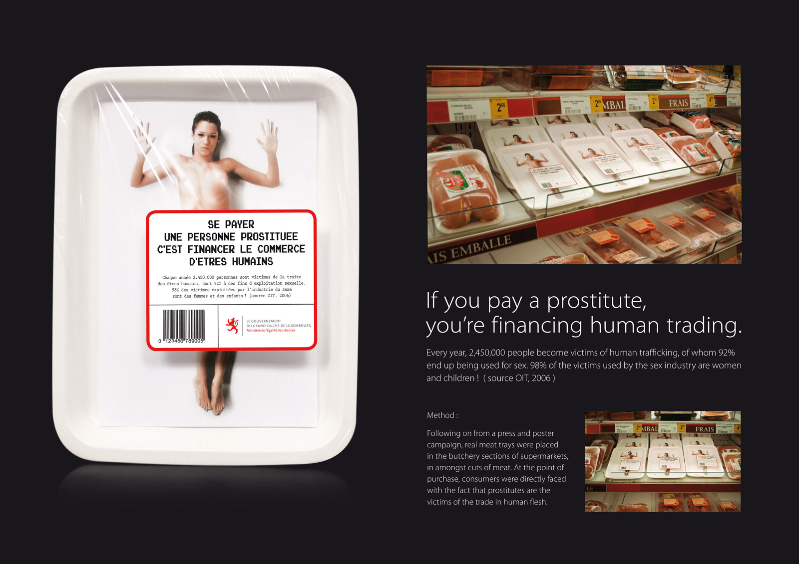 Campanha do governo de Luxemburgo para combater o tráfico de pessoas. Além do anúncio impresso foram colocadas à venda diversas simulações na sessão de carne dos supermercados. A ação impacta o público masculino e conta com o apoio de dados da Organização Internacional do Trabalho, mostrando que aqueles que pagam por sexo também são culpados por fincanciar este mal.