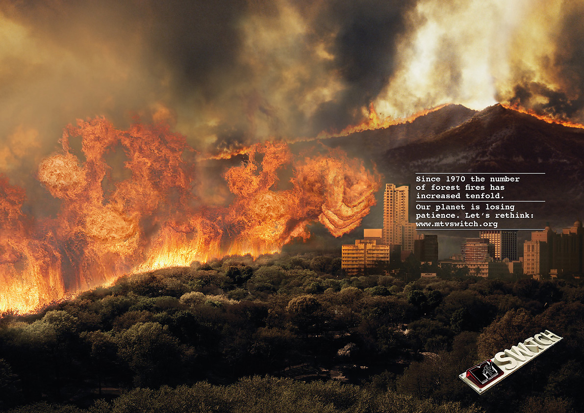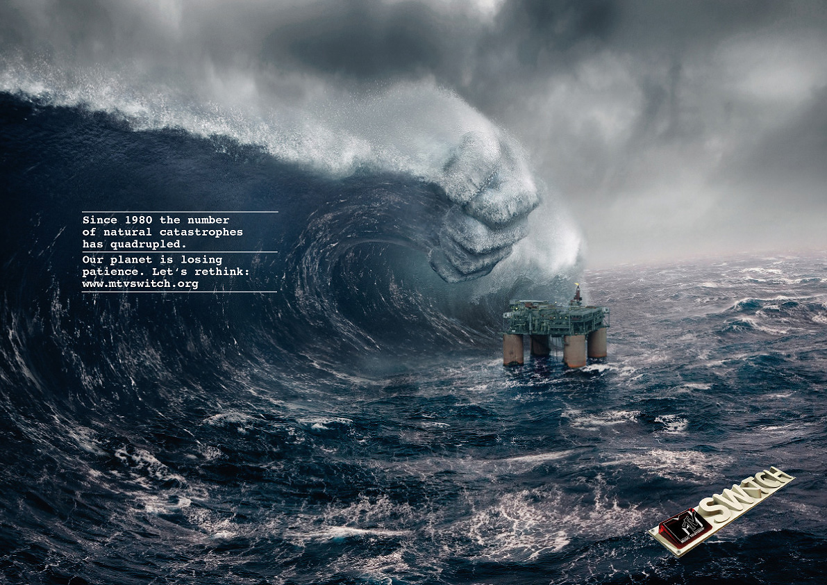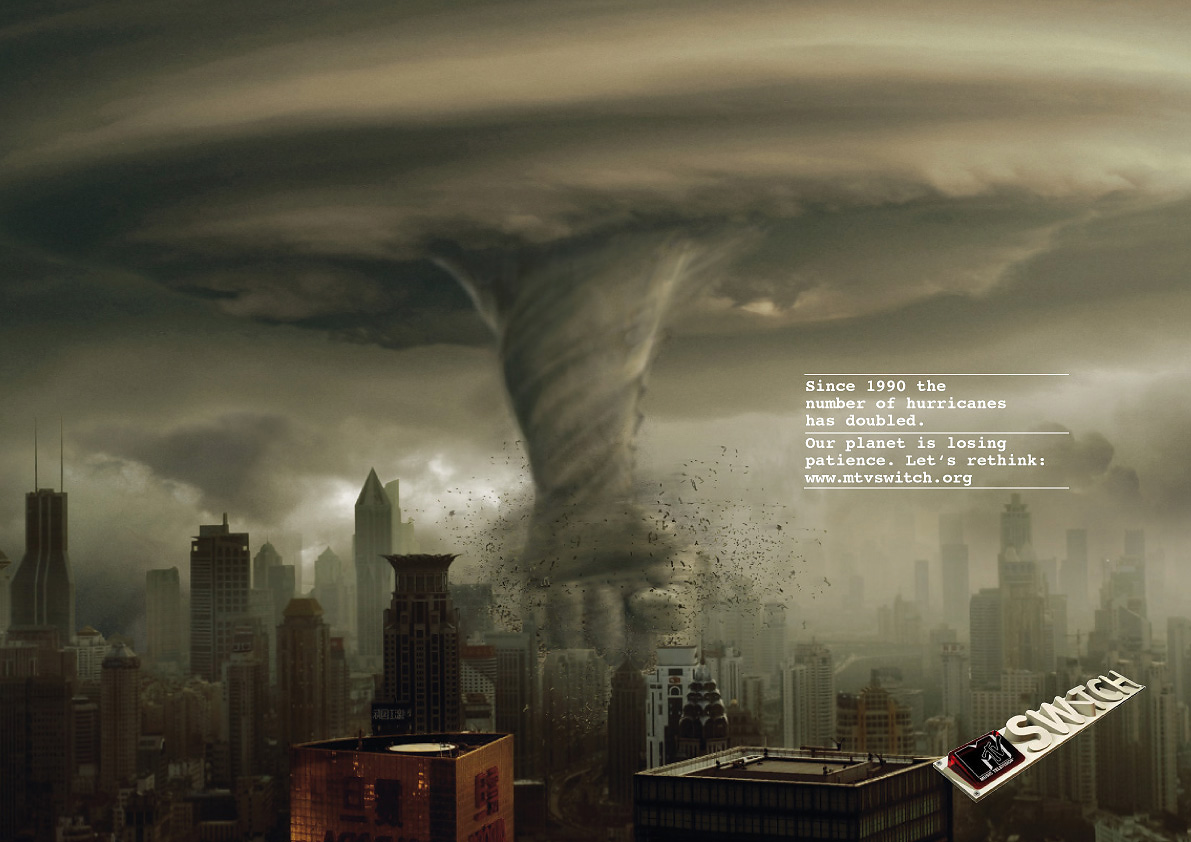 Campanha da MTV Switch baseada em dados que mostram o crescente número de desastres naturais nos últimos anos. Tsunamis, furacões, queimadas… A assinatura diz: O nosso planeta está perdendo a paciência. Triste coincidência com o lançamento da campanha, na madrugada de domingo para segunda um terromoto aconteceu em Abruzzo, na Itália, matando mais de 150 pessoas e deixando 100 mil desabrigados.