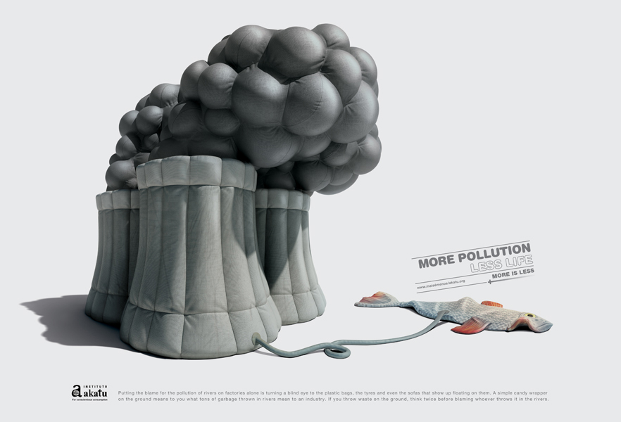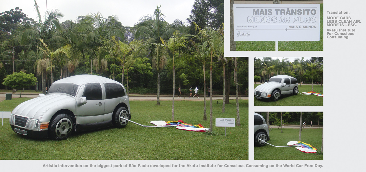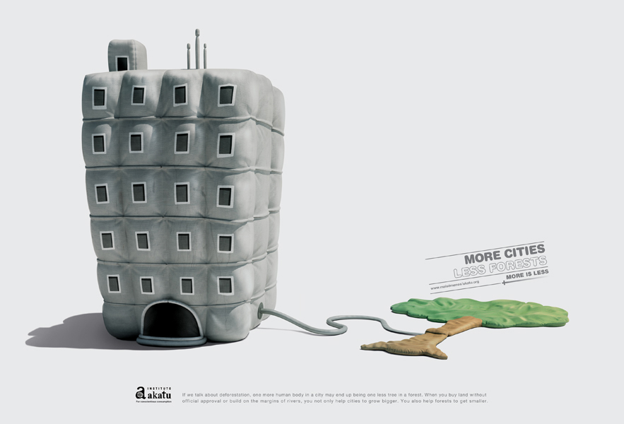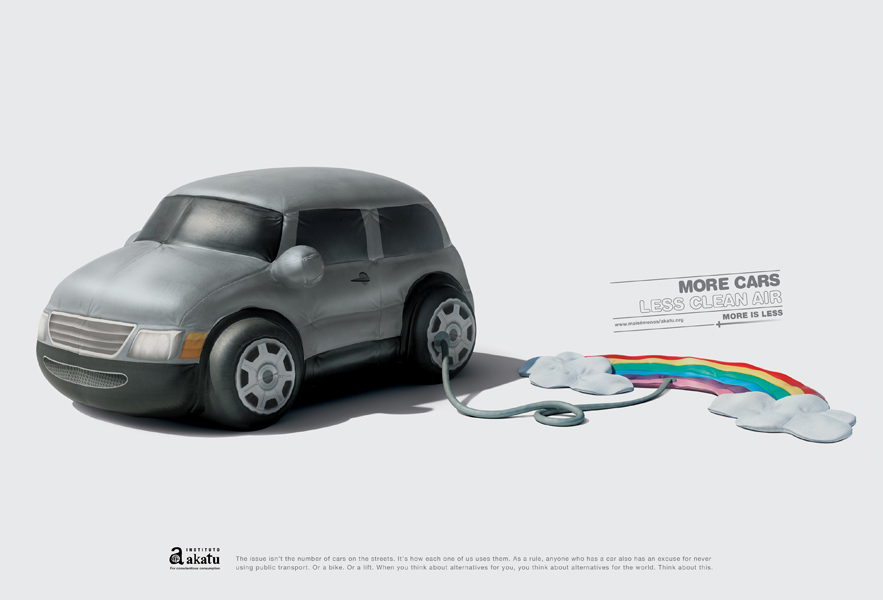 Campanha do Instituto Akatu feita pela agência brazuca Lew´Lara\TBWA. O conceito envolve a idéia de consumo consciente, que marca a comunicação e o trabalho do Instituto Akatu. O texto mostra a relação de perde/ganha movida pelo consumo, se existir mais trânsito, vamos ter menos ar puro, com mais cidades teremos menos florestas, etc. As belas ilustrações em 3D foram feitas pela Seagull Fly.