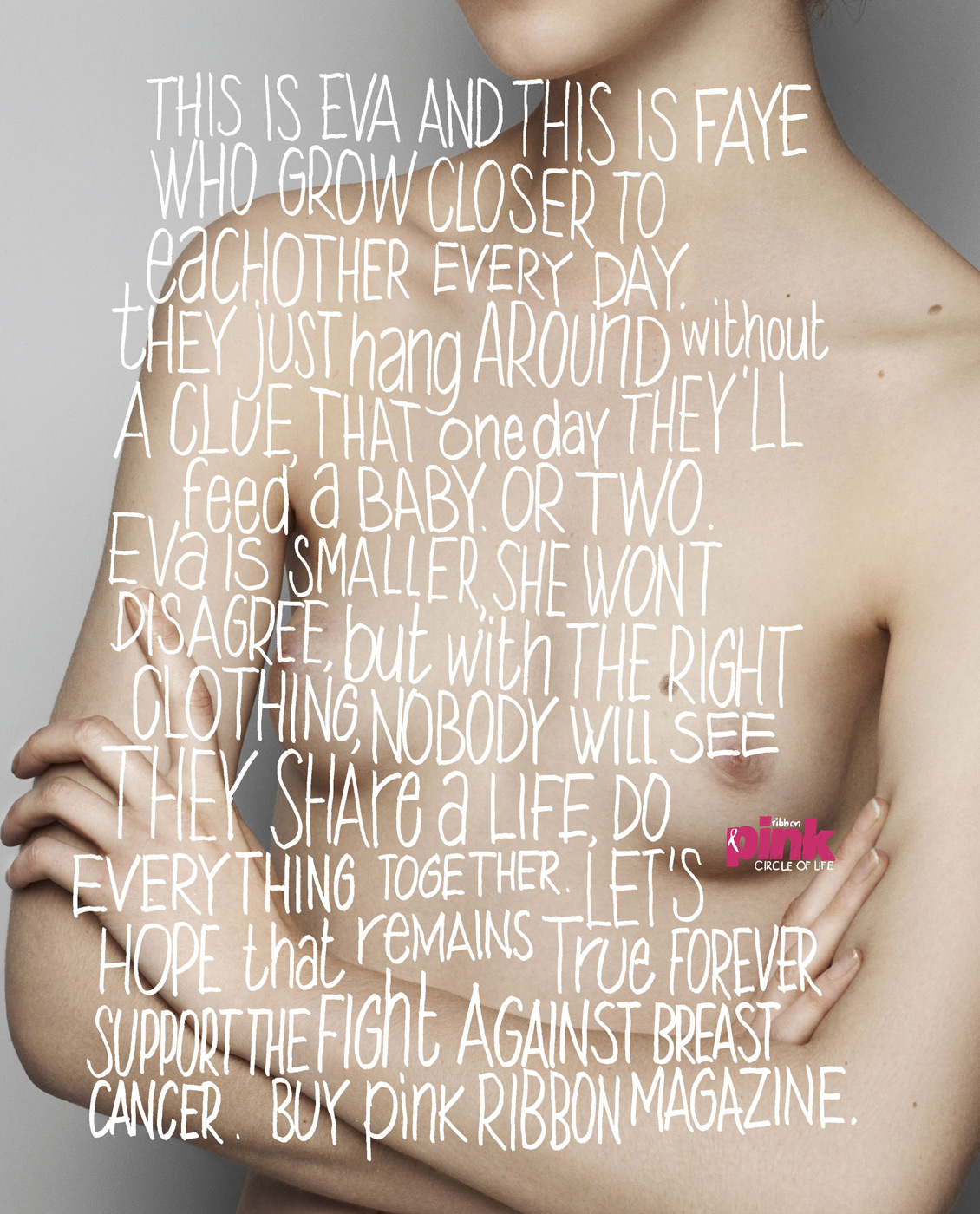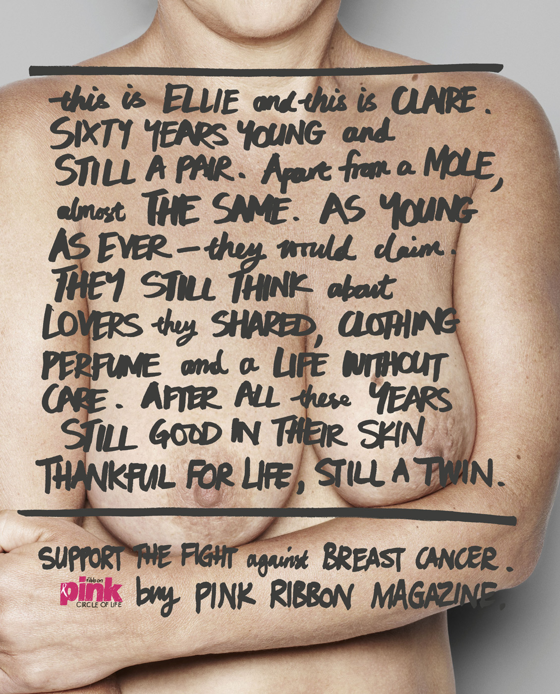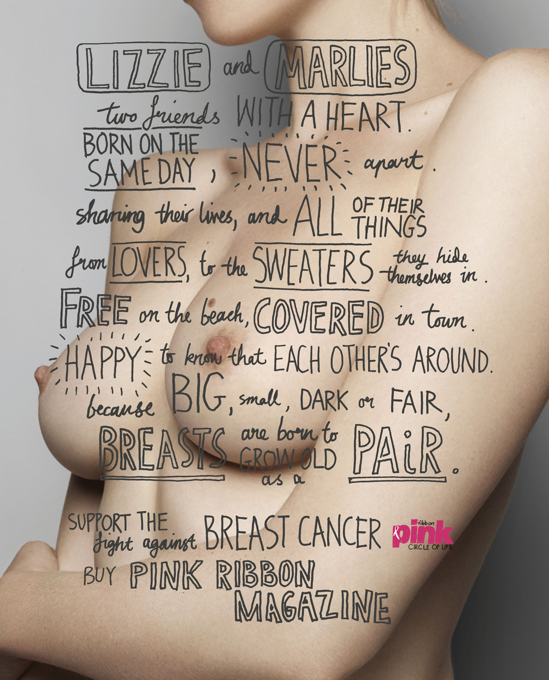 A Pink Ribbon Magazine é uma revista que aborda moda, estilo de vida feminino e conscientiza o leitor sobre o câncer de mama, uma das doenças que mais mata mulheres no mundo todo. Na nova campanha da revista, a agência grey bolou uma série de poemas que mostram a história de vida dos seios das mulheres, com uma perspectiva diferente para falar de um assunto tão pesado.