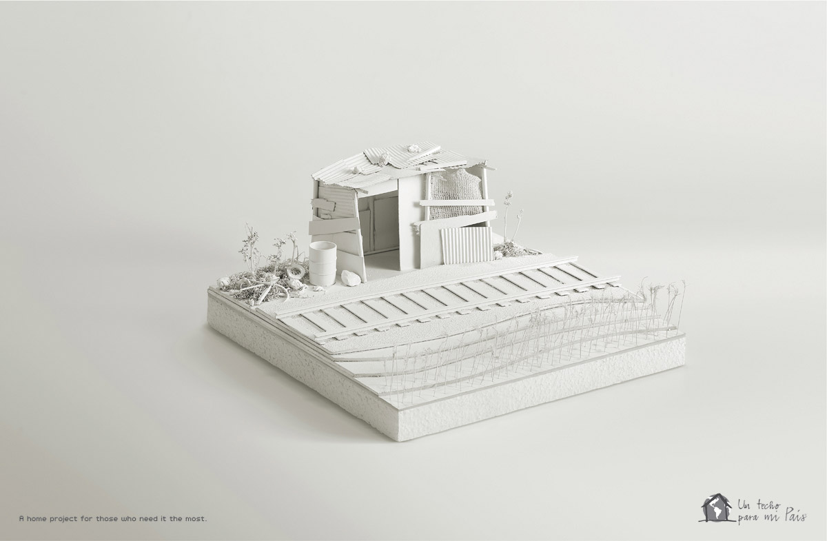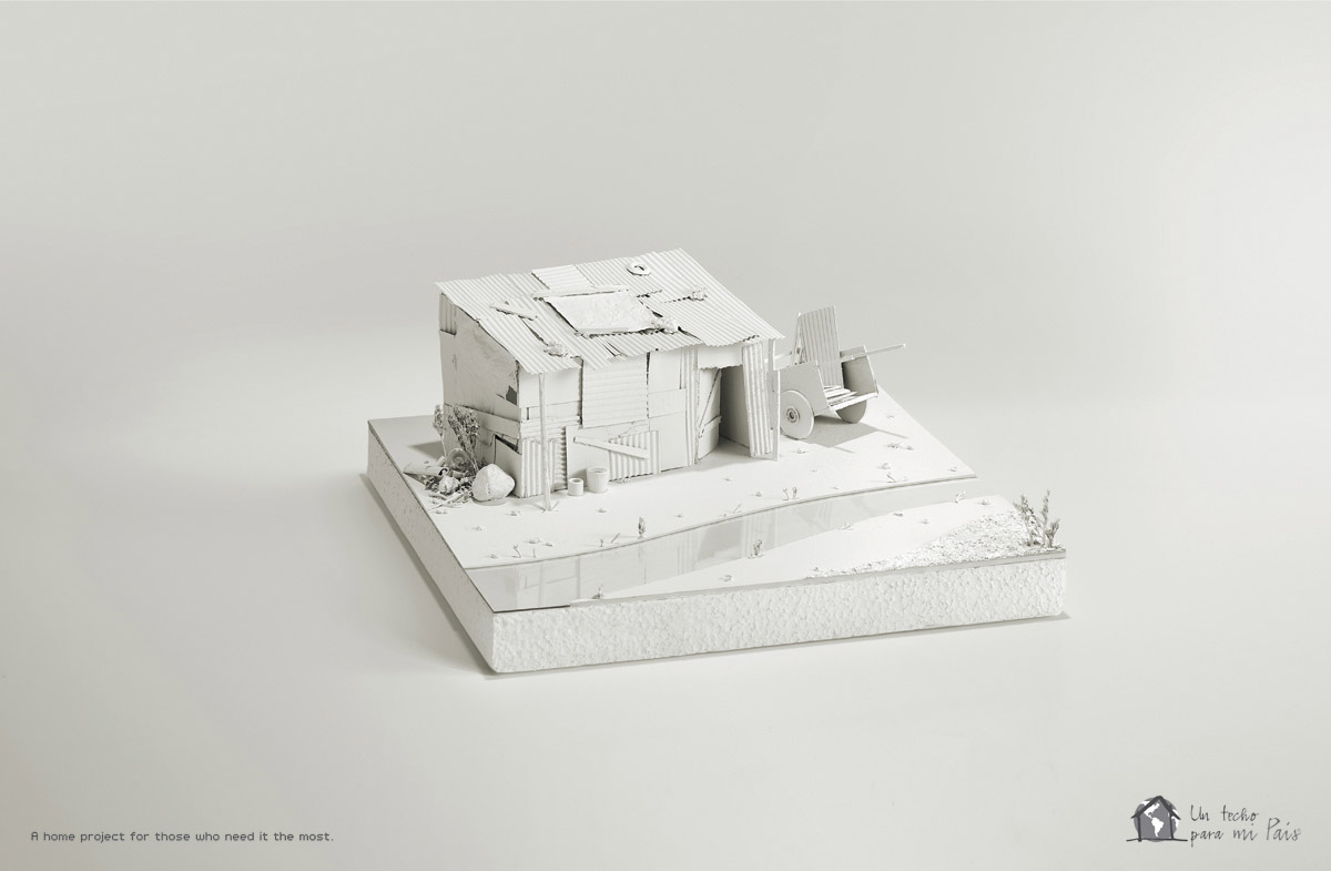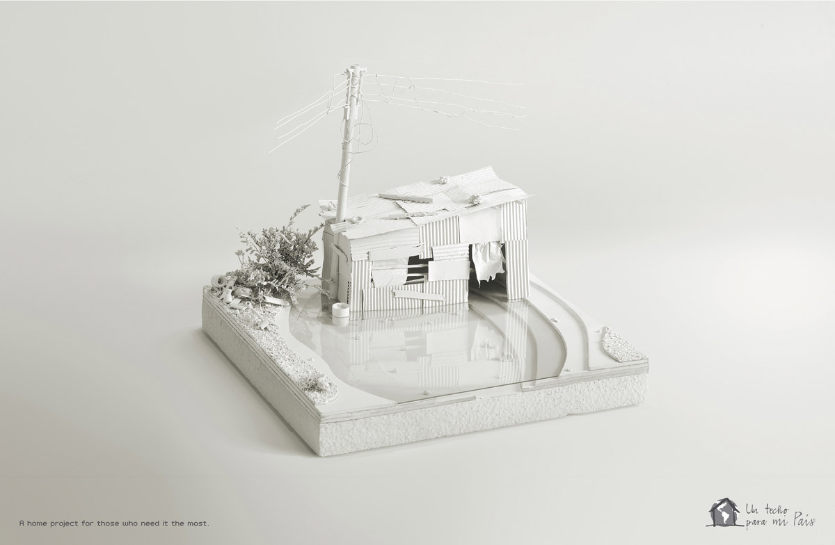 Campanha da “Un techo para mi pais”, uma organização latino-americana que nasceu no Chile em 1997. Criada por um grupo de jovens universitários, a UTPMP sentia a necessidade de denunciar para a sociedade a péssima situação em que muitas pessoas vivem na America Latina. Esta campanha impressa feita com maquetes mostra bem este problema, a assinatura diz: “Um projeto de lar para aqueles que mais precisam.”