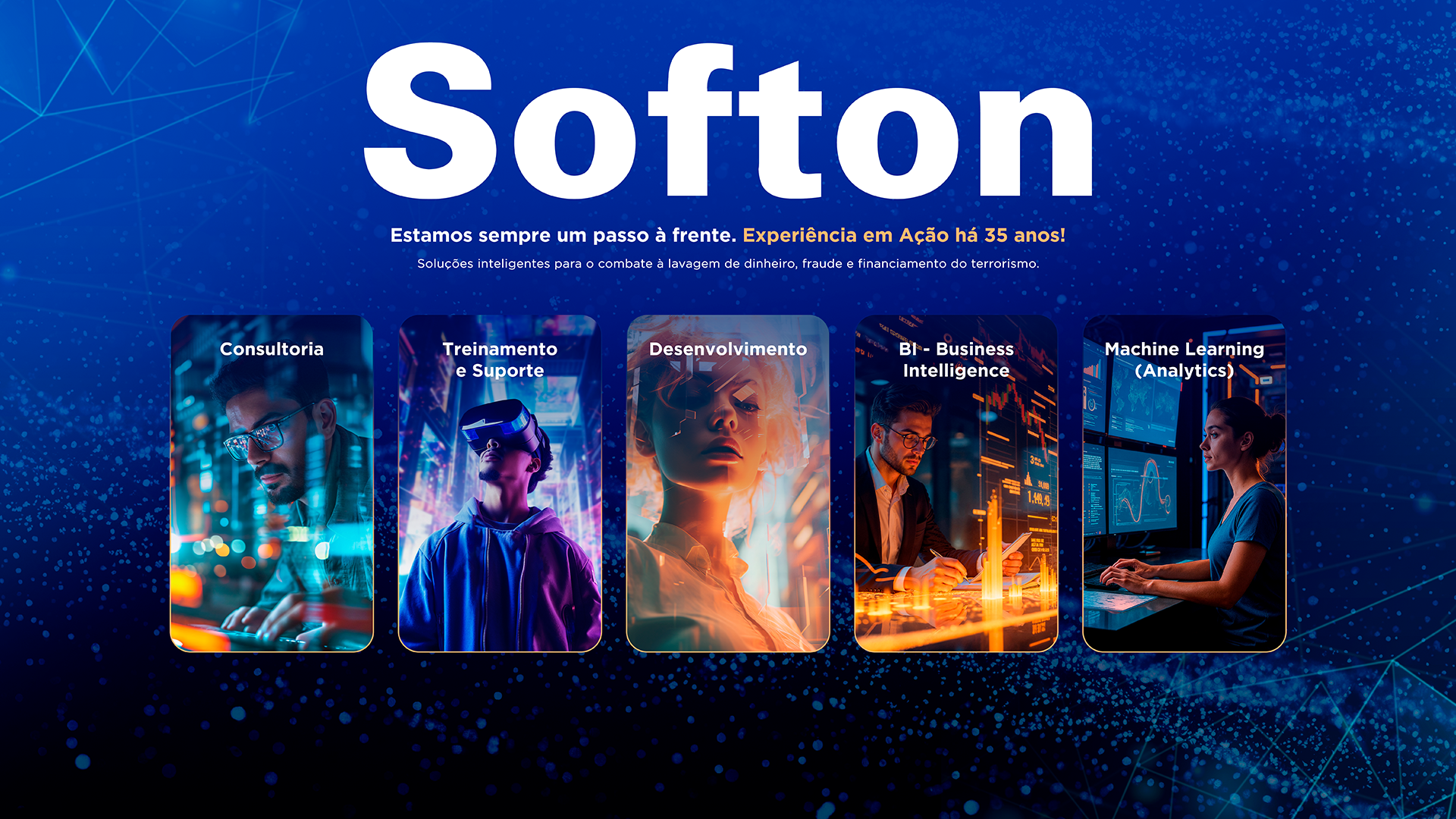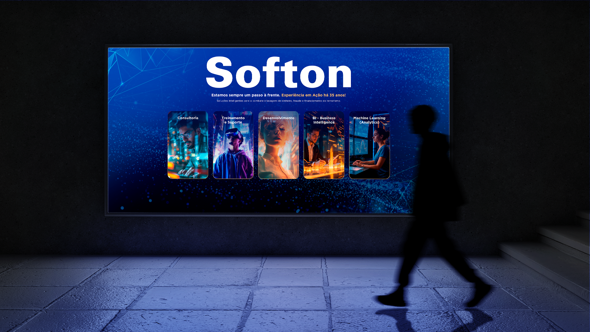 Desde o início dos anos 90, a Softon atua de forma pioneira em Inteligência Artificial e desenvolve expertise no combate a fraudes e lavagem de dinheiro. A empresa mantém um compromisso constante em aplicar tecnologia de ponta em seus produtos. Esse posicionamento guiou a concepção do estande e sua narrativa visual. A entrega do projeto envolveu desde a identidade visual da Softon até a ambientação do espaço. Criamos cada imagem para reforçar a solidez tecnológica da marca e seu pioneirismo.
