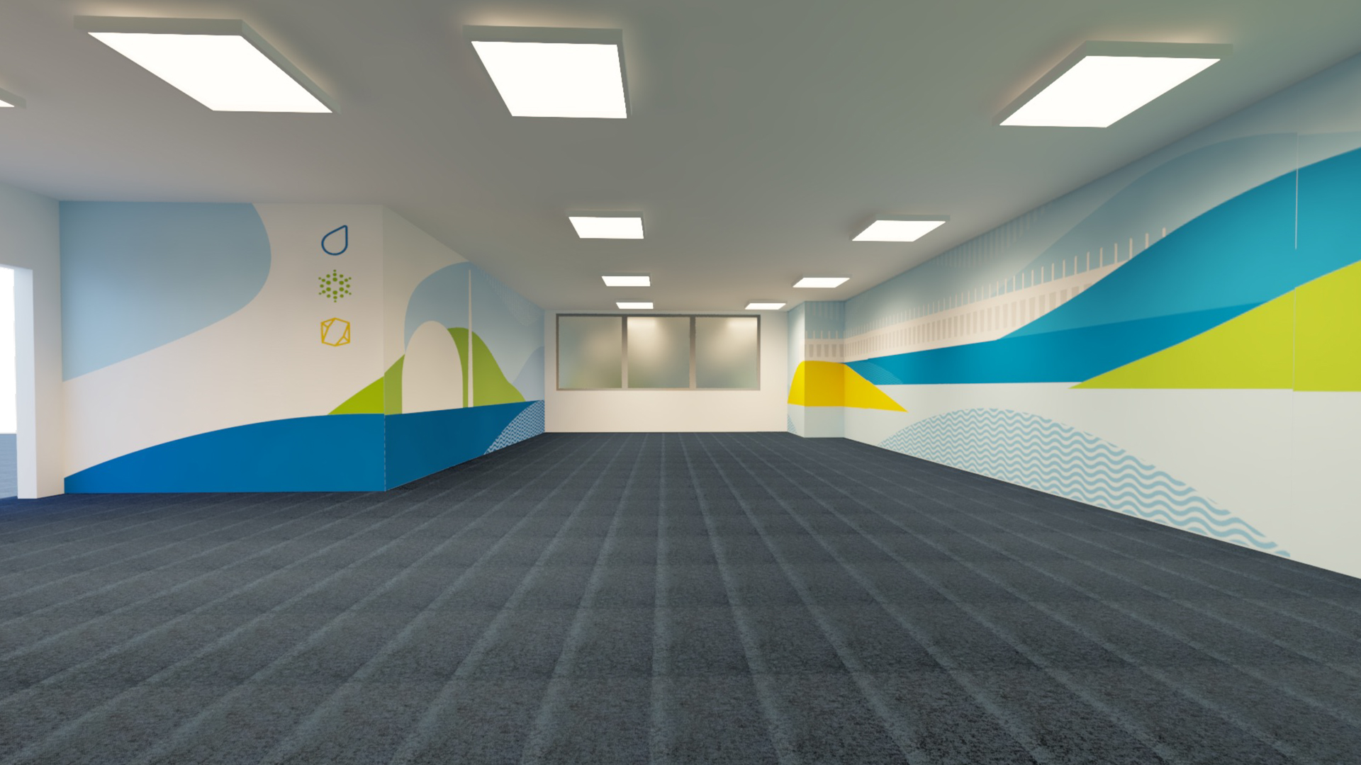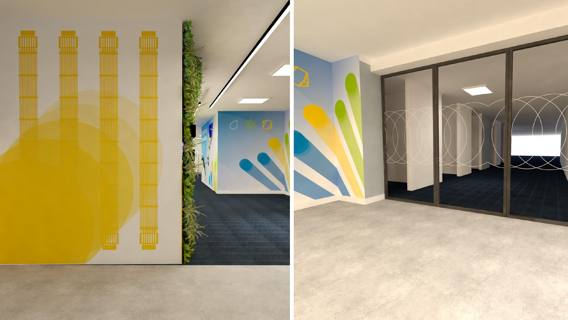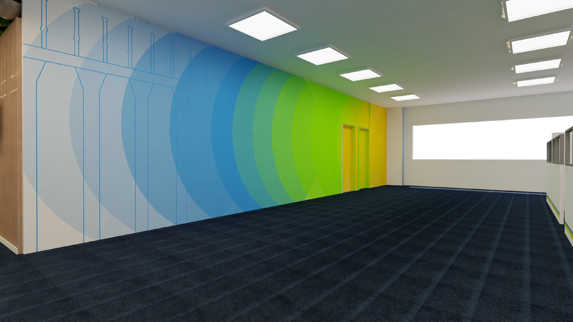 Por fim, os grafismos completam a identidade do novo escritório da ENBPar. Eles surgem do movimento, da vibração e da fluidez presentes na água, no átomo e no minério. Desse estudo visual, criamos ilustrações que conversam com as frentes de atuação da ENBPar. Assim, cada ambiente do escritório passa a refletir de forma coerente a importância da energia limpa e o papel das empresas na construção do futuro energético do país.