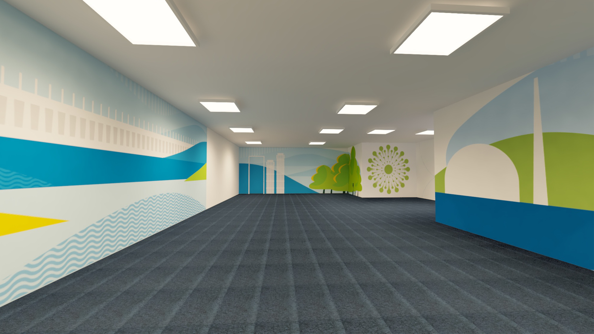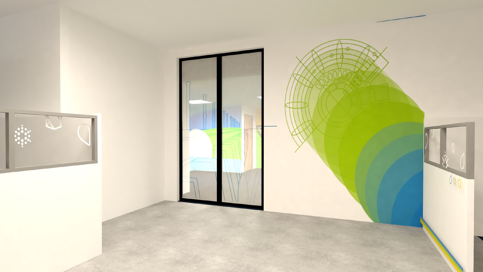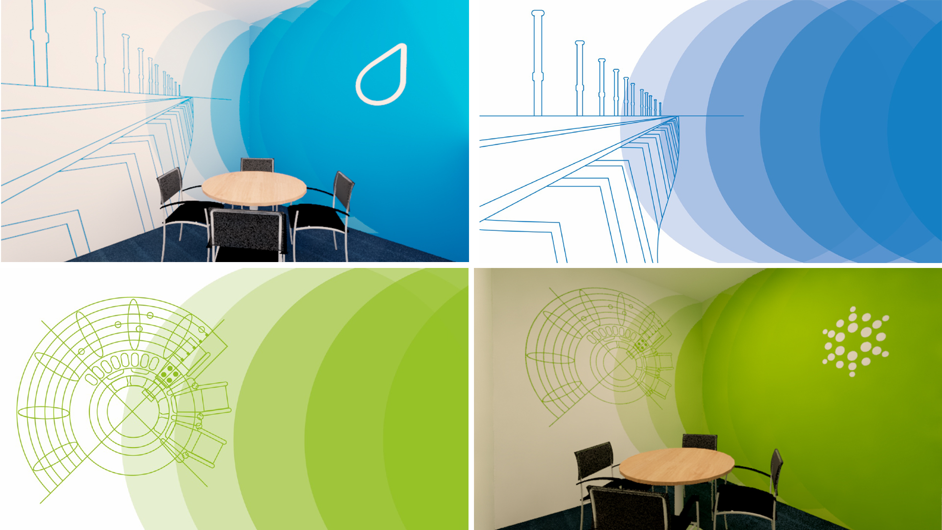 Por fim, os grafismos completam a identidade do novo escritório da ENBPar. Eles surgem do movimento, da vibração e da fluidez presentes na água, no átomo e no minério. Desse estudo visual, criamos ilustrações que conversam com as frentes de atuação da ENBPar. Assim, cada ambiente do escritório passa a refletir de forma coerente a importância da energia limpa e o papel das empresas na construção do futuro energético do país.