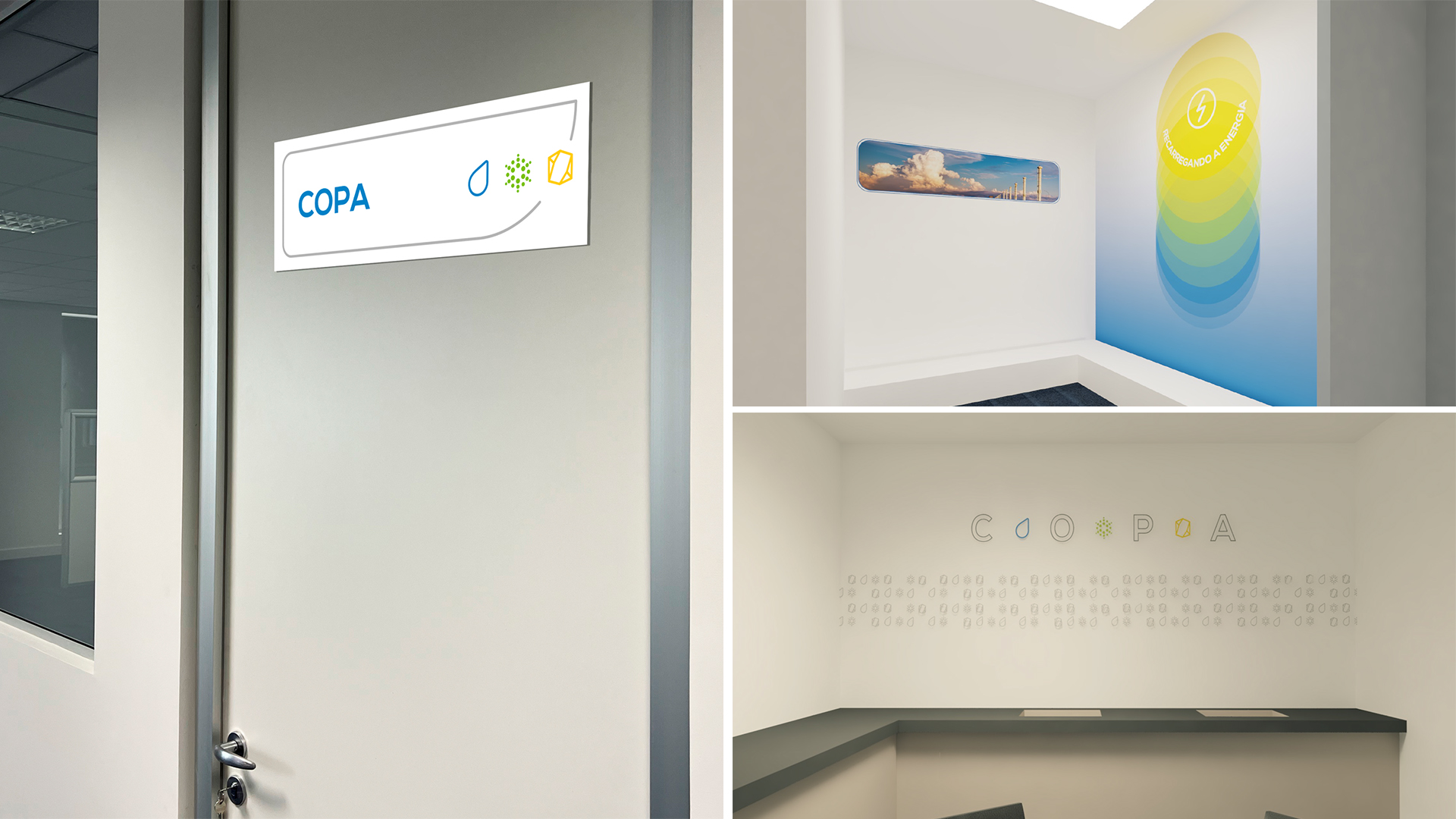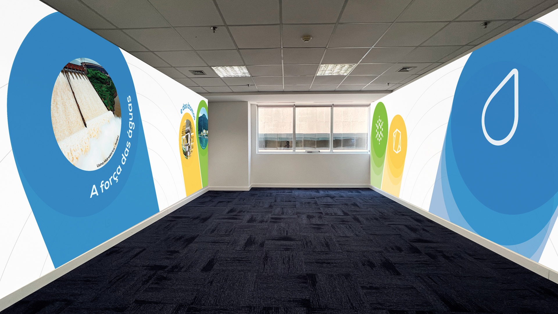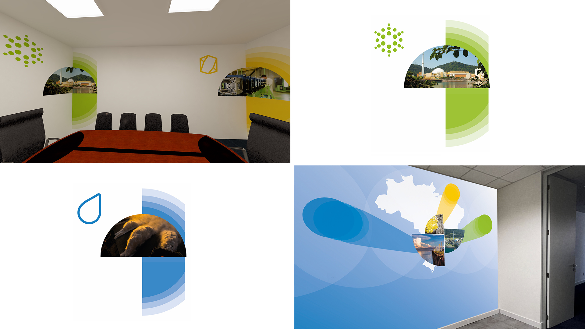 O maior desafio esteve na criação de uma identidade única. Entretanto, encontramos equilíbrio ao unir elementos que representam a energia limpa no Brasil. Dessa forma, trabalhamos uma linguagem que dialoga com o movimento das águas, com as geometrias do átomo e do minério.